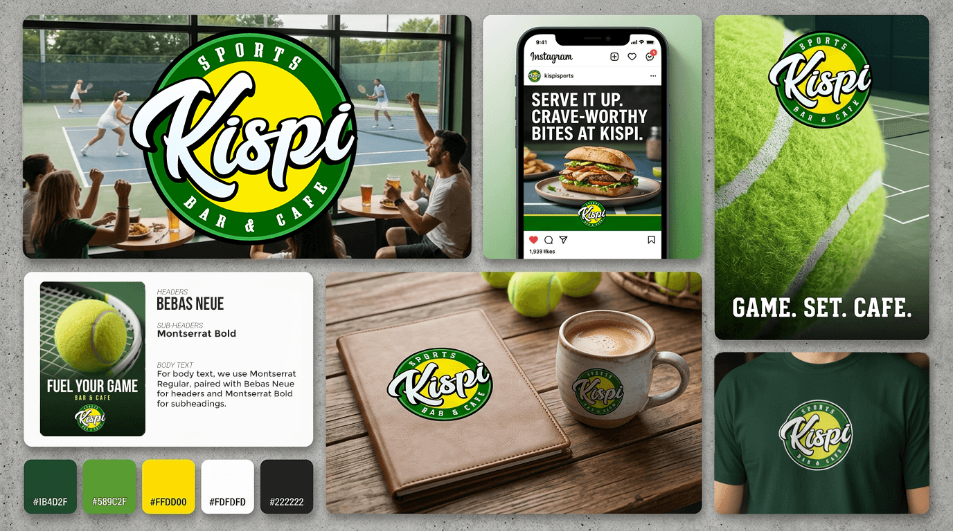 The visual identity is inspired by energetic, sports bar & café environments, combining modern typography with approachable colors.